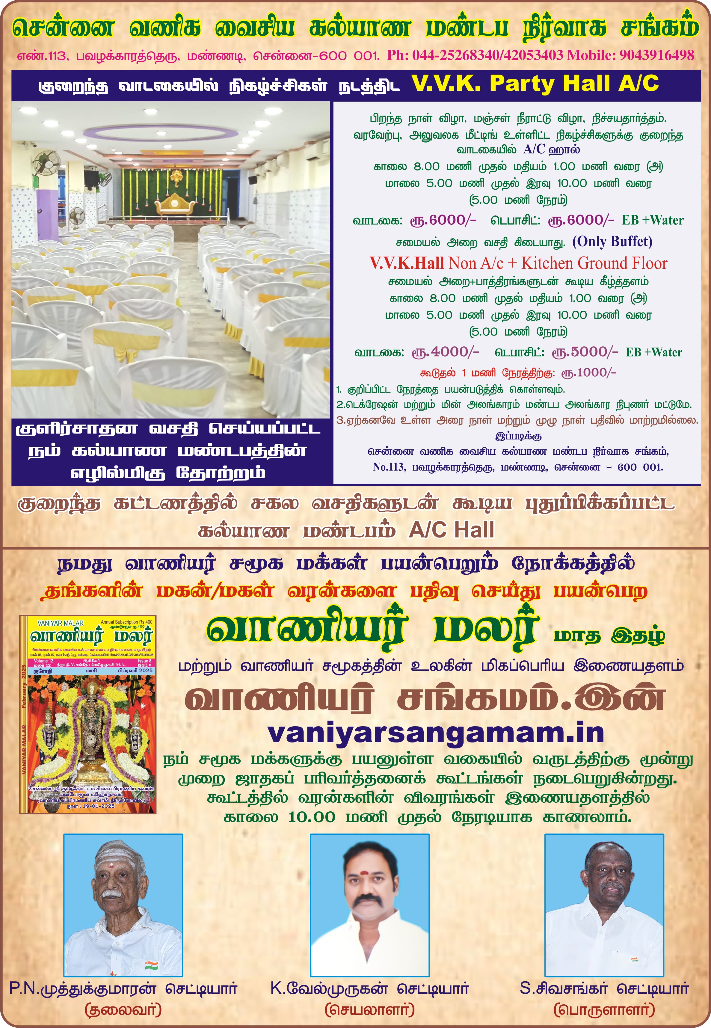 பதிவுசெய்யப்பட்டவர்கள் வரன்களை சரிபார்த்து உங்கள் சொந்த நலன்களின் அடிப்படையில் முடிவெடுக்க வேண்டும். வாணியர் சங்கமம் திருமண சேவை, தகவல் நோக்கங்களுக்காக மட்டுமே செயல்படுகிறது. பதிவுசெய்யப்பட்டவர்கள் தேவையற்ற/சட்ட சிக்கல்களுக்கு வாணியர் சங்கமம் பொறுப்பல்ல. திருமணம் உறுதி செய்யப்பட்ட பிறகு, பதிவு செய்யப்பட்டவர்கள் நமது சங்க அலுவலகத்திற்குத் தெரிவிக்குமாறு கேட்டுக்கொள்கிறோம். மேலும் நமது சங்கத்திற்கு உட்படாத மற்றும் தனிப்பட்ட நபர்களின் இணைய தளங்களில் நீங்கள் பதிவு செய்தால், அதற்க்கு சங்க நிர்வாகம் பொறுப்பு ஏற்காது.
